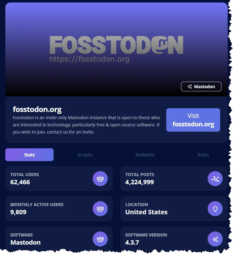 According to fedidb.org 1, Fosstodon currently has 62k+ registered users; 9k active users; 4m+ posts. The twelfth largest Fediverse server by monthly active users.