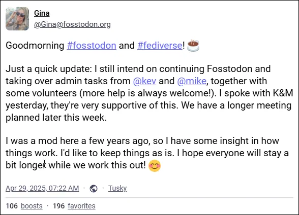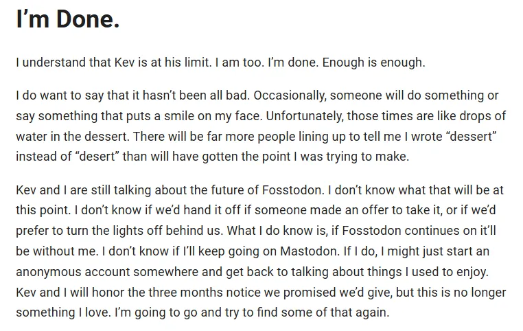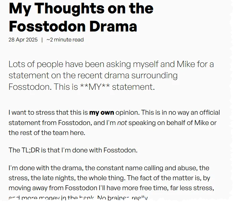- Mike and Kev, who appear to be the founders of fosstodon have issued statements to say they are moving on and leaving fostodon. Mike is quite clear he is "Done. Enough is enough" 4. Kev is "done with the drama". 5