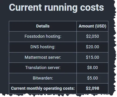 Kev's post seems to suggest he has been financing some of the costs of fosstodon -- that is an untenable situation, given the sheer size and number of people on the server.